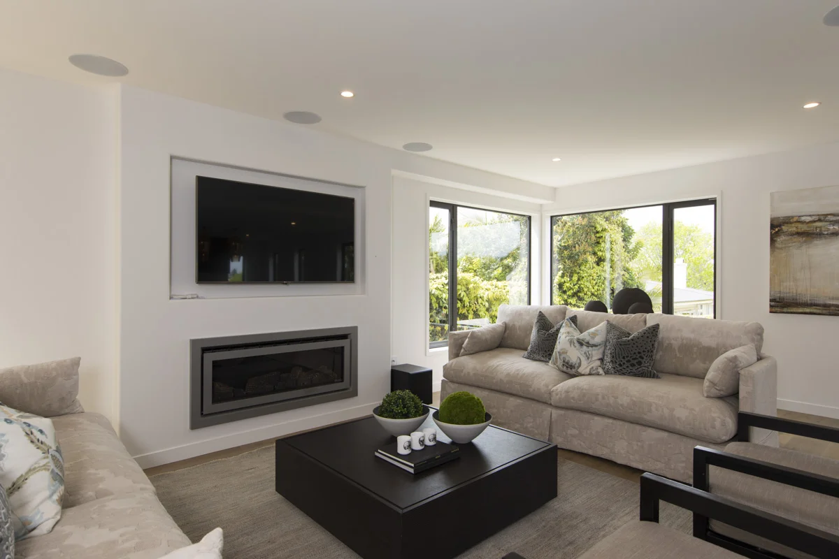 Their security system has cameras covering the front of the home and the alarm has ‘stay’ mode so it is fully armed in specific areas throughout the house but the residents won’t set it off at night. Their 7.1 home theatre system is fitted with in-ceiling speakers and the TV is wall mounted for the ultimate cinema experience. The client can stream Spotify or whichever audio they choose to the master bedroom, outdoor deck and for work-at-home days they can even stream music to their office!